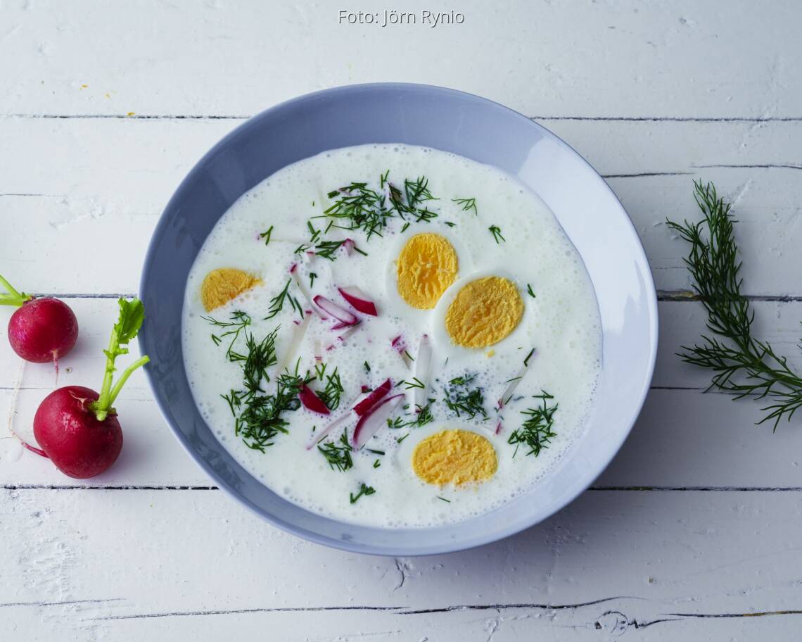 Die Suppe auf tiefe Teller verteilen. Die Eier pellen und in Scheiben schneiden. Die Sommersuppe mit den Eierscheiben belegen und sofort servieren.