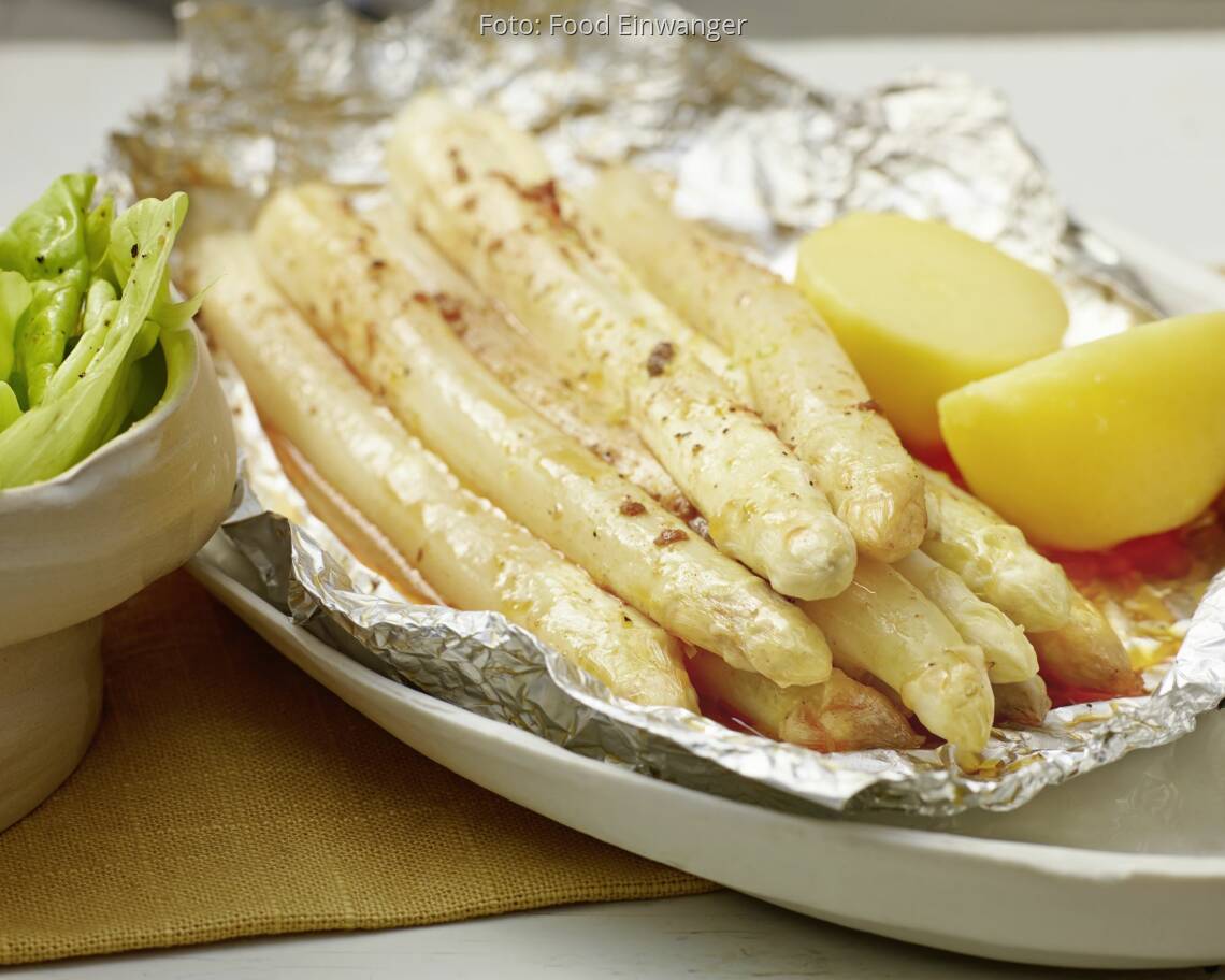 Die Päckchen herausnehmen, öffnen und den Spargel mit der Flüssigkeit, die sich in der Folie gebildet hat, auf vier vorgewärmte Teller anrichten. Den Spargel sofort servieren. Dazu schmecken Pell- oder Bratkartoffeln und ein frischer Kopfsalat.
