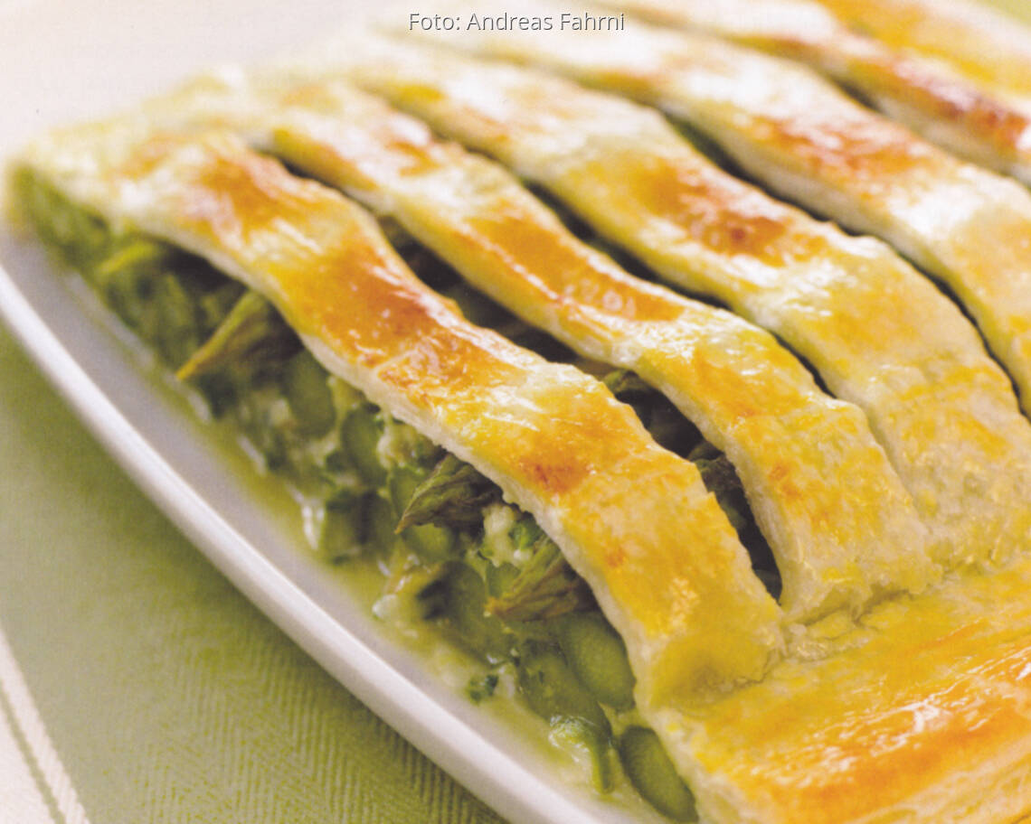 Die Spargelpastete im auf 220 Grad vorgeheizten Ofen auf der untersten Rille 20-25 Minuten backen. Heiß oder lauwarm servieren. Als Beilage passt ein reichhaltiger Salat.