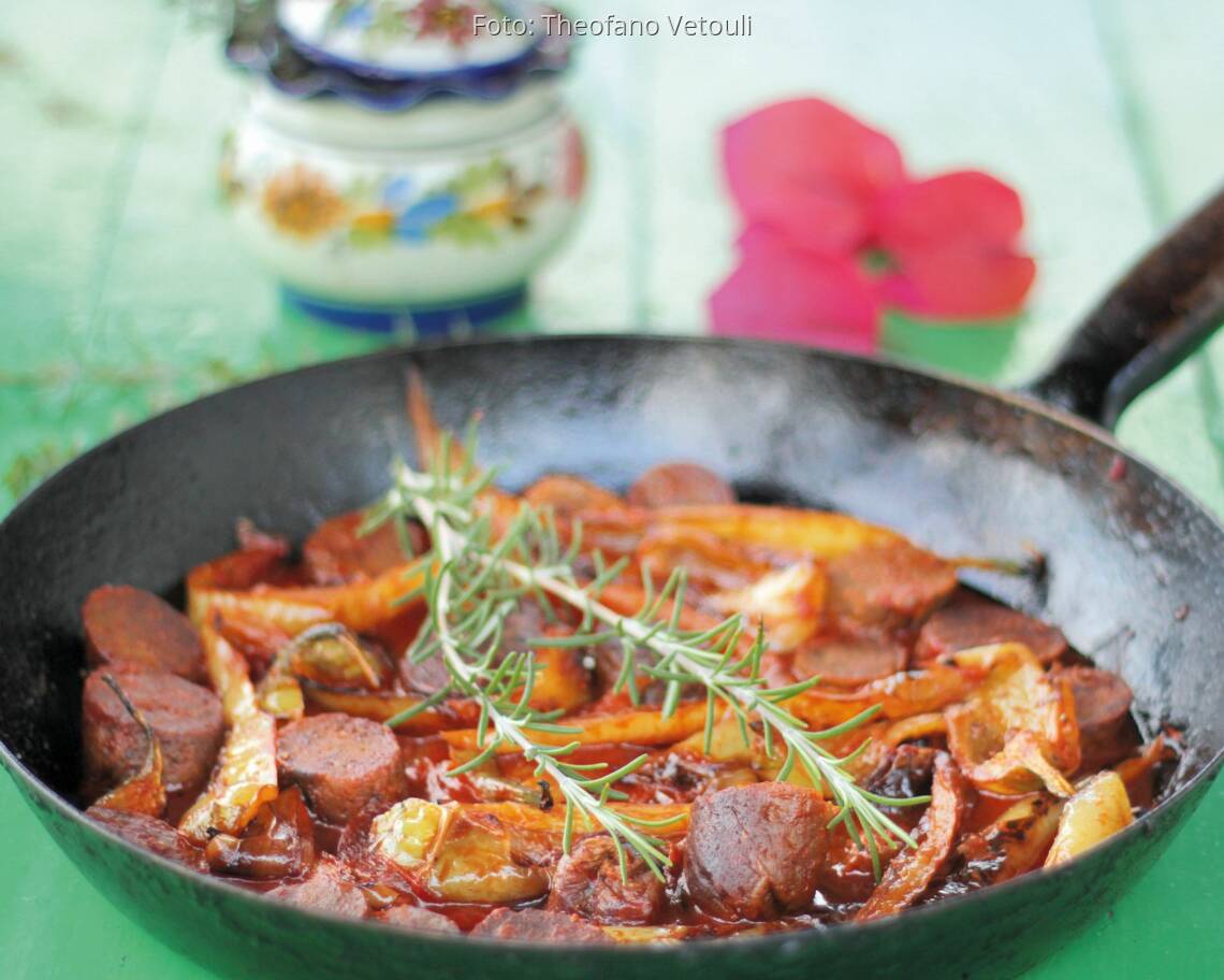 Foto: Theofano VetouliSpetzofai – Paprikapfanne mit veganen Würstchen