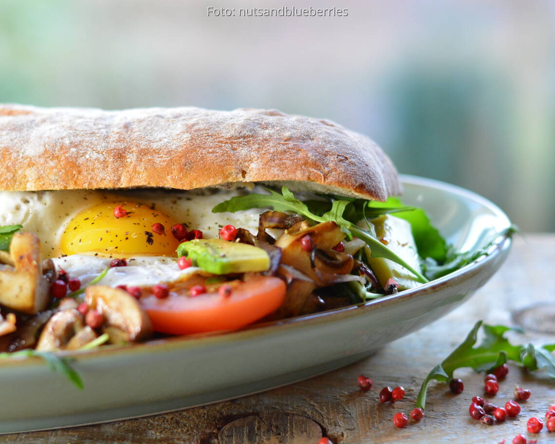 mit Vollkornbrötchen, Bio-Eier, Champignons, Avocado