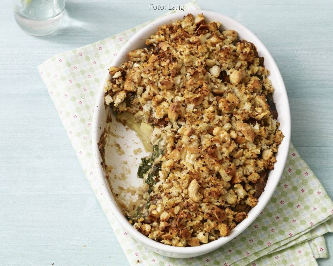 Für die Kruste das Brötchen in kleine Stücke zupfen und im elektrischen Blitzhacker mit den Cashewkernen, Senf, übrigem Öl und restlichem Knoblauch grob zerkleinern. Nach 10 Min. Backzeit über den Auflauf streuen.