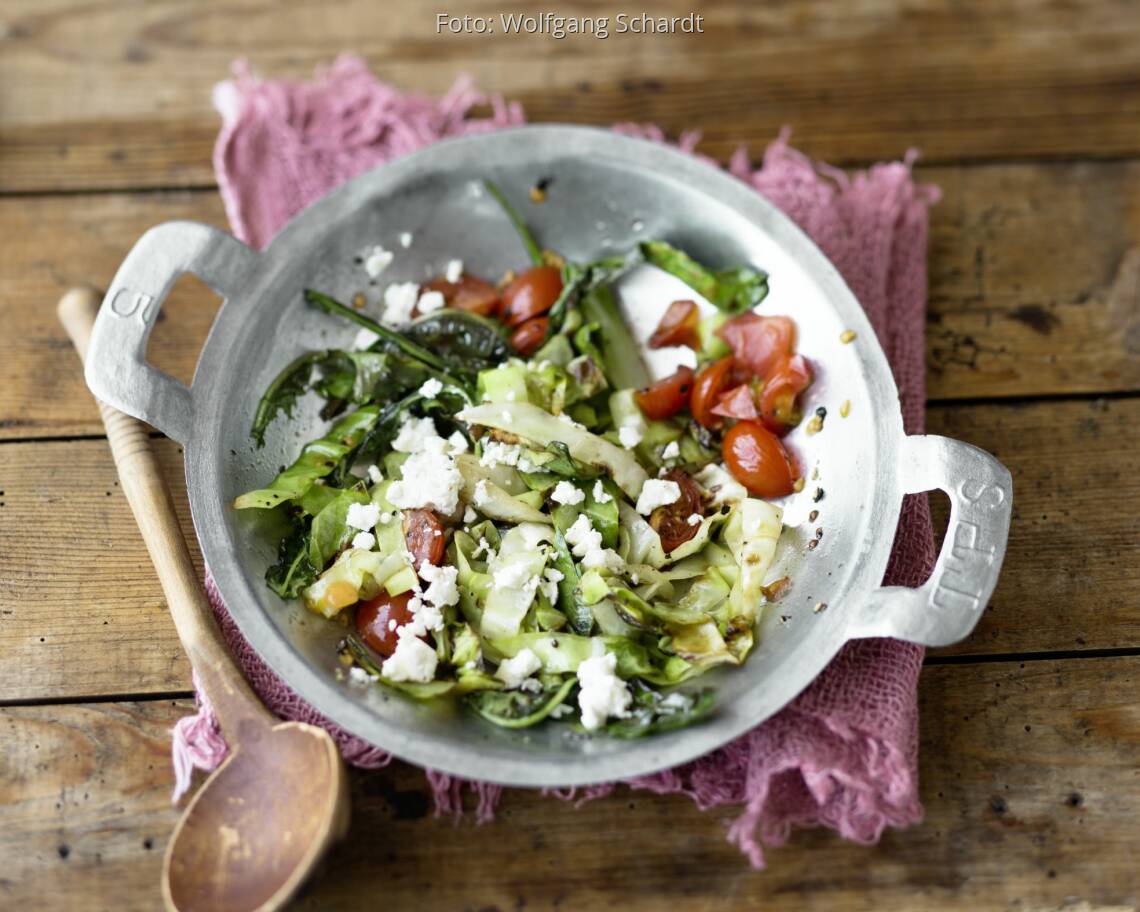 Den Wok erhitzen und das Öl hineingeben. Die Kohlstreifen einrühren, salzen und bei starker Hitze in 4–5 Min. bissfest braten. Löwenzahn und Tomaten kurz mitbraten, salzen und pfeffern. Schafskäse zerkrümeln und aufstreuen.