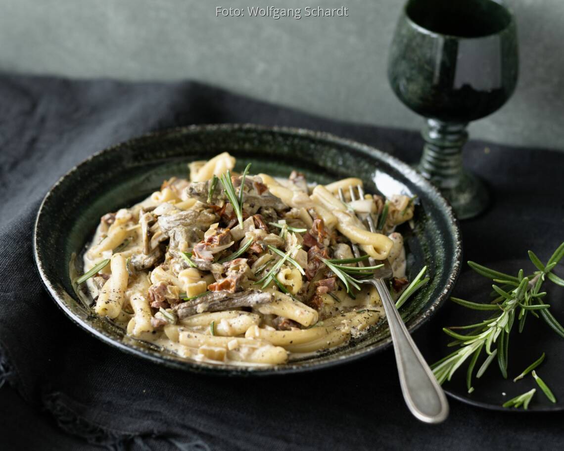 Brühe und Sahne dazugeben, aufkochen und noch ca. 5 Min. einkochen lassen. Mit Salz, Pfeffer und Essig abschmecken. Mit frisch gekochten Nudeln (z. B. Tagliatelle oder Casarecce) mischen.