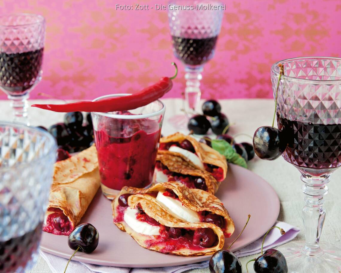 Zottarella Rolle abtropfen lassen und in Scheiben schneiden. Crêpes mit Zottarellascheiben belegen, mit Kirschsauce beträufeln und zusammenfalten.