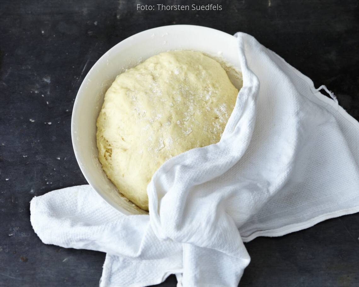 Den Teig mit einem Tuch abdecken und an einem warmen Ort in 35–40 Min. auf das doppelte Volumen aufgehen lassen.