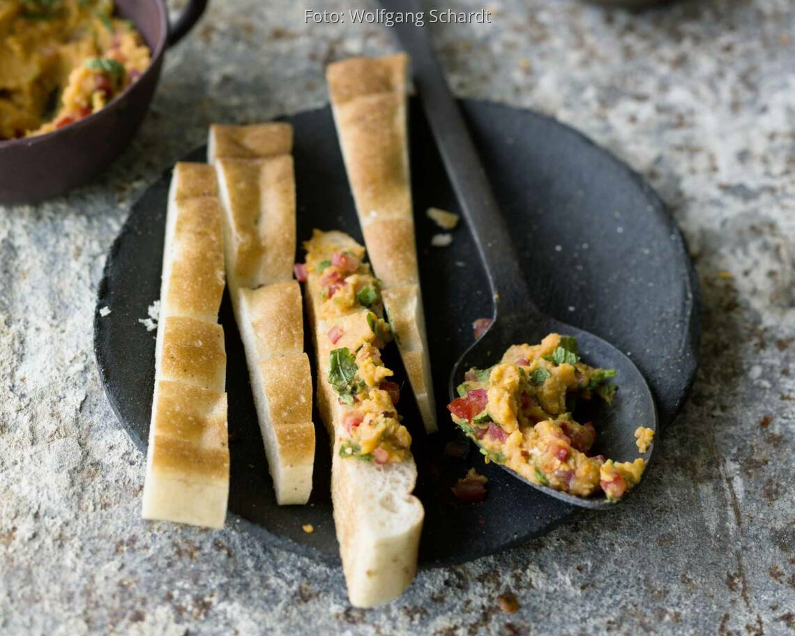 Die Tomaten waschen, vierteln, vom Stielansatz befreien, entkernen und fein würfeln. Mit der Minze unter den Aufstrich rühren, nochmals abschmecken. Falls der Aufstrich zu fest ist, etwas Kokosmilch unterrühren. Passt zu Fladenbrot.