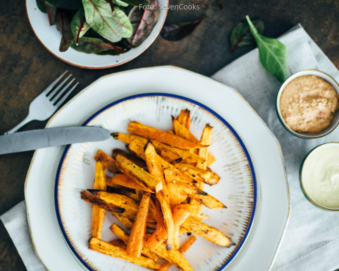 Zum Schluss die Süßkartoffelpommes anrichten und mit den Dips servieren. Guten Appetit!