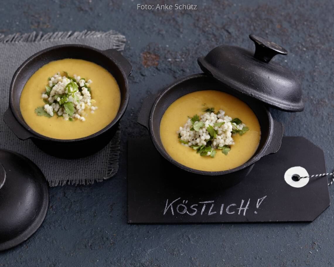 Die Papayastücke dazugeben und alles 5 Min. weiterköcheln lassen. Dann die Limettenblätter entfernen. Die Suppe mit dem Stabmixer pürieren und kräftig mit Salz und Pfeffer abschmecken. Die Graupen mit dem gehackten Koriander mischen und mit der Suppe servieren.