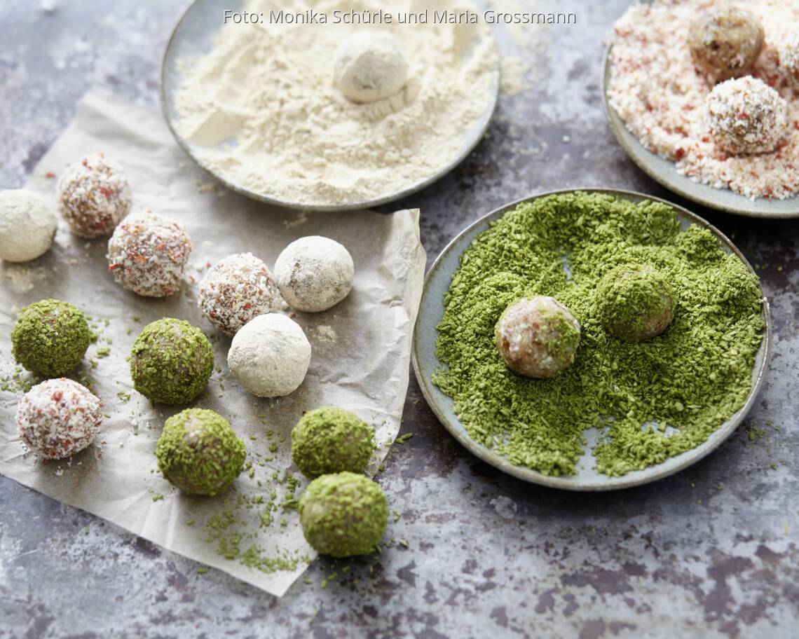 Aus dem Teig Kugeln in der Größe einer Praline formen, in den orangefarbenen Gojibröseln, in den grünen Matchabröseln oder in Macapulver wälzen.