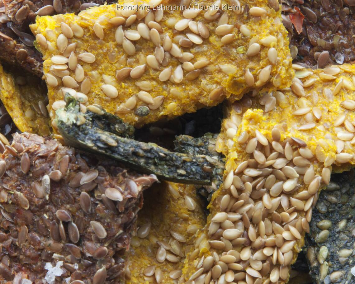 In eine Schüssel umfüllen, restliche Leinsamen unterrühren. Möglichst dünn, maximal 0,5 cm dick, auf ein Backblech oder einen Dörrbogen streichen. Mit einem Messer oder Teigschaber Linien in den Teig drücken, an denen die Cracker später in Stücke gebrochen werden.