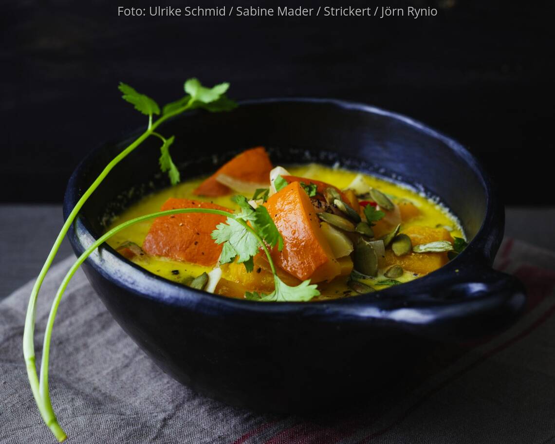 Inzwischen die Kürbiskerne in einer beschichteten Pfanne ohne Fett bei mittlerer Hitze rösten. Das Koriandergrün kalt abbrausen und trocken schütteln, die Blätter und die feinen Stängel hacken. Nun die Suppe mit Limettensaft und -schale sowie Salz und Pfeffer abschmecken. Kürbistopf auf Teller verteilen, mit Koriandergrün und Kürbiskernen bestreuen und genießen.