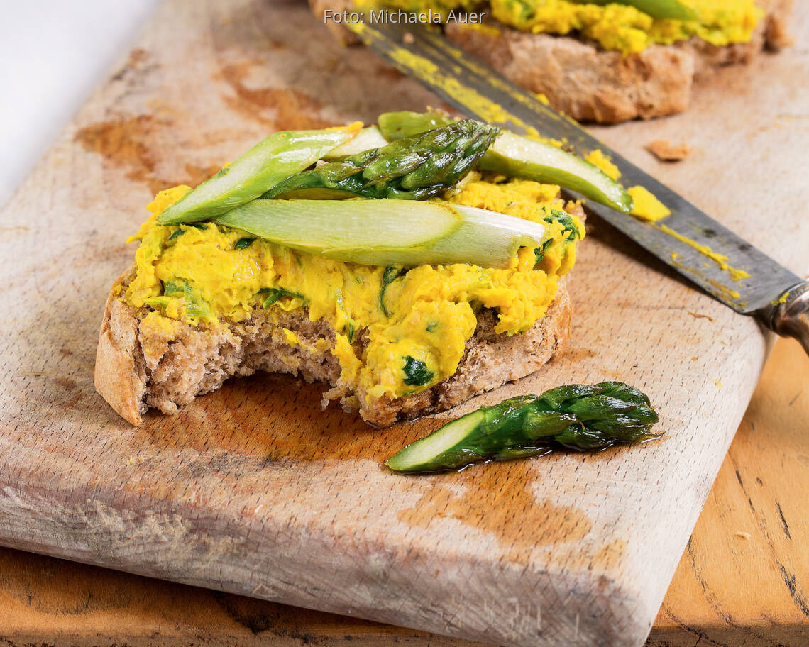 Foto: Michaela AuerToast mit gelbem Erbsenpüree und grünem Spargel