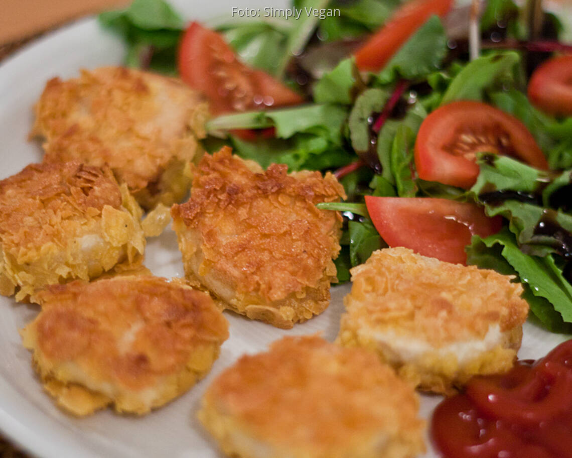 Die Tofunuggets erst in dem Teig-Gemisch und dann in den Cornflakes wenden.