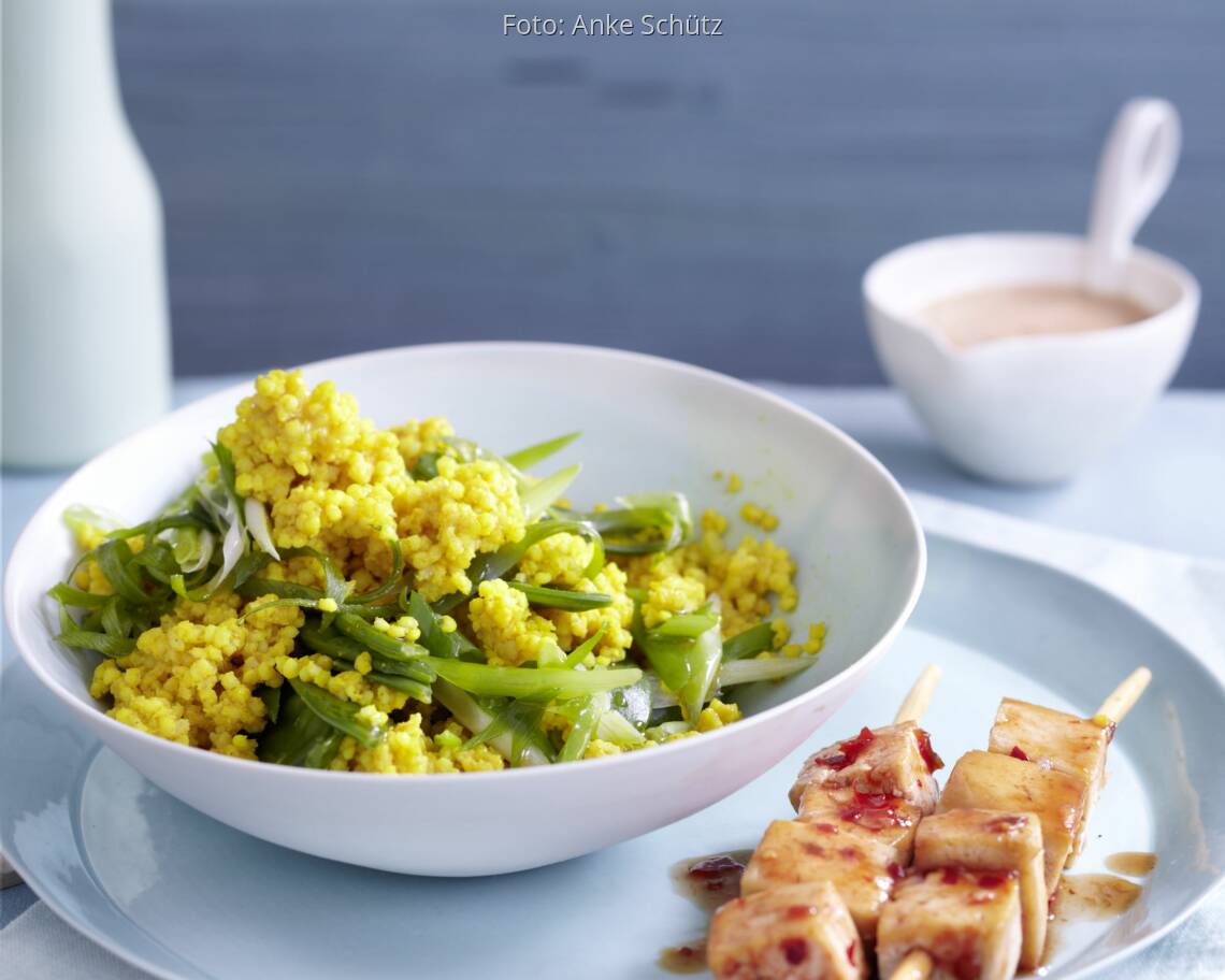 Foto: Anke SchützTofu-Saté mit Zuckerschotenhirse