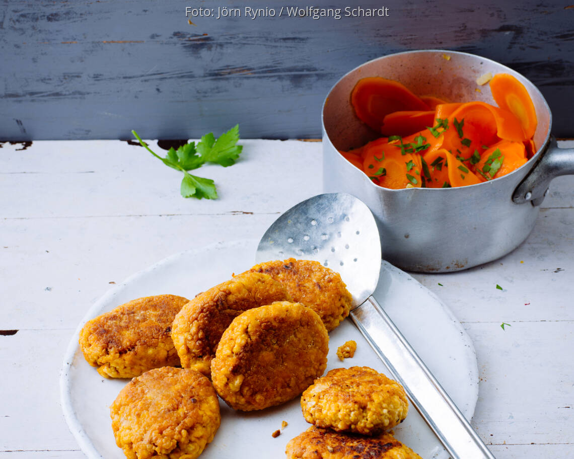 Für die Bratlinge die Möhre schälen, putzen und fein raspeln. Zwiebel und Knoblauch schälen und fein würfeln. Das Öl in einem Topf erhitzen und darin Möhre, Zwiebel und Knoblauch 1–2 Min. anbraten. Kurkuma, Paprikapulver und Tomatenmark unterrühren, die Mischung in einem Sieb abtropfen und abkühlen lassen.