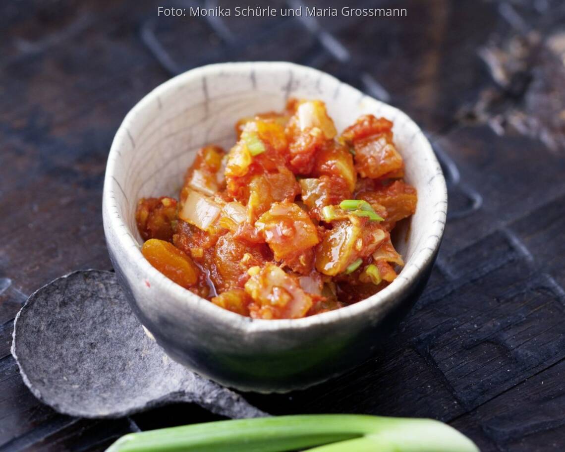 Chutney mit Salz, Pfeffer und Zucker würzen, mit dem Stabmixer leicht anpürieren und abkühlen lassen. Nach Belieben das Grün von 2 Frühlingszwiebeln in feine Ringe schneiden und unter das abgekühlte Chutney mischen.