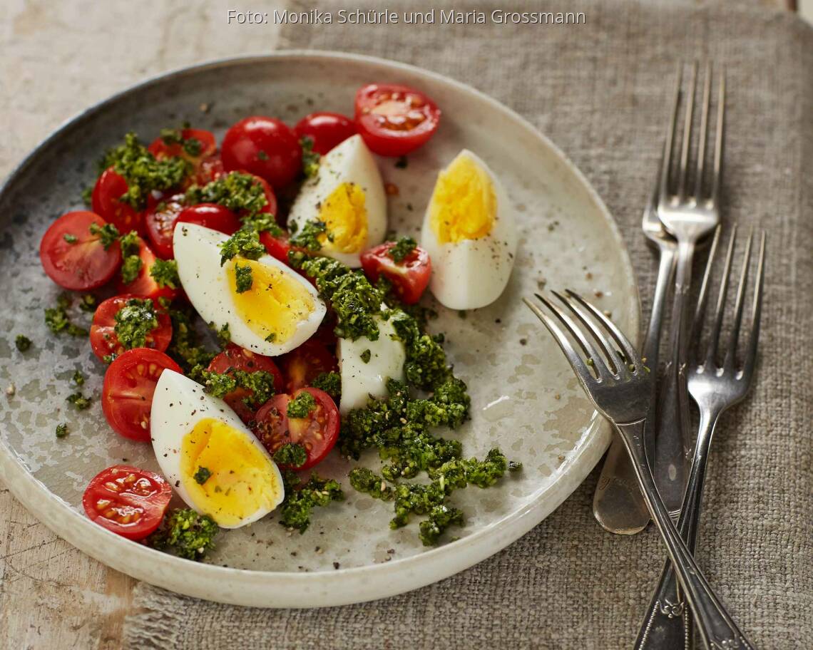 Foto: Monika Schürle und Maria GrossmannTomaten-Eier-Salat mit Petersilien-Kürbiskern-Pesto