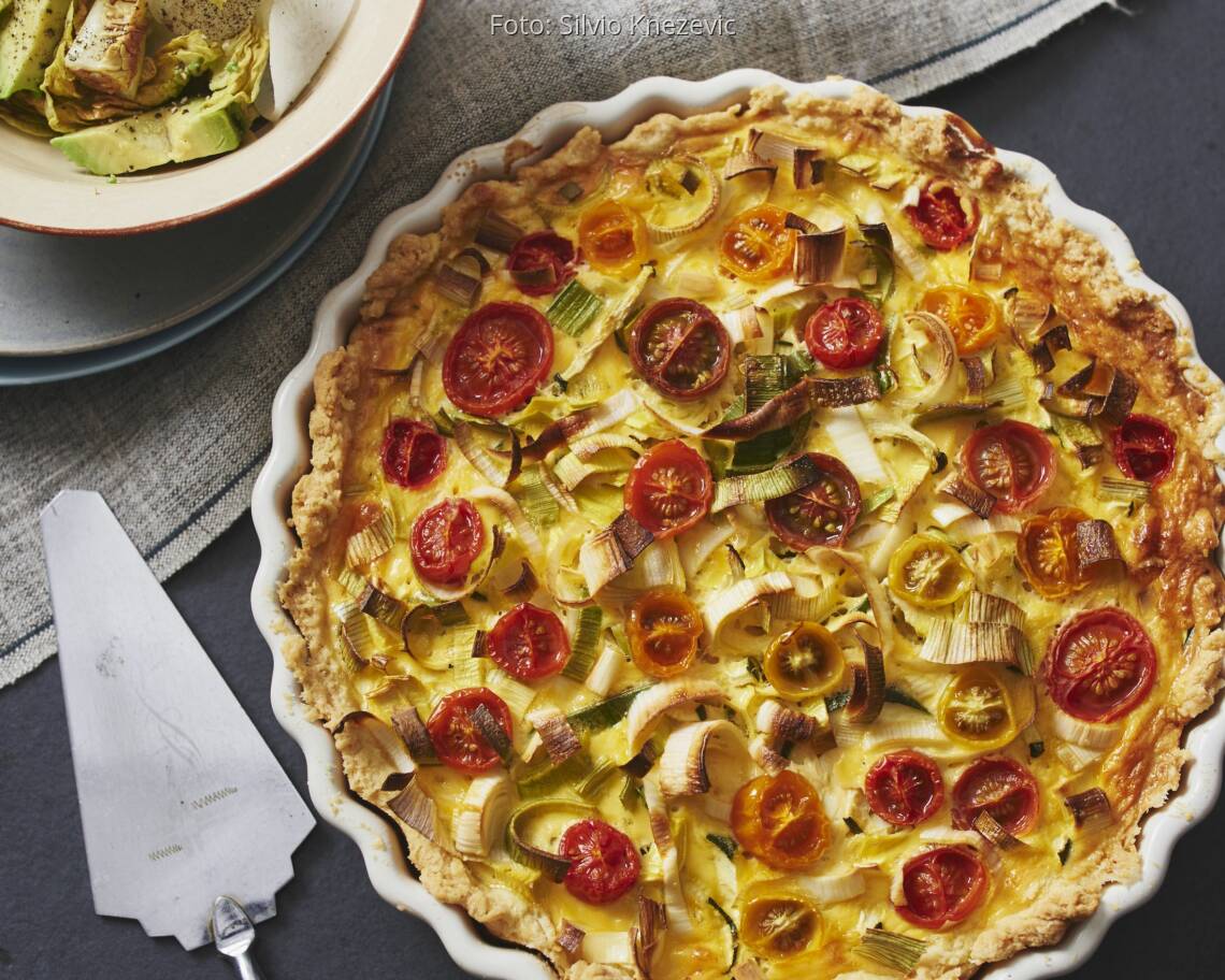 Den Lauch und den Zucchino auf dem Teigboden verteilen. Die Crème fraîche mit den restlichen Eiern verquirlen und mit Salz, Pfeffer, Muskat und Chili würzen. Den Guss auf das Gemüse gießen, die Tomatenhälften mit den Schnittflächen nach oben darauf verteilen. Die Tarte im Ofen in weiteren 40 Min. fertig backen.