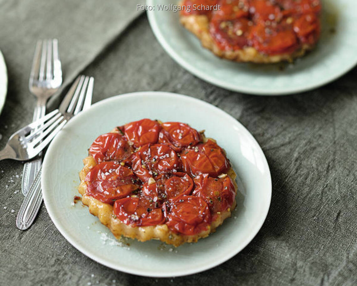 Teig in 6 Stücke teilen, jedes auf wenig Mehl zu einem Kreis von 8 cm Ø ausrollen. Jeweils 1 Teigkreis auf die Tomaten legen und am Rand nach unten in die Form drücken. Im Ofen (Mitte) in 15–20 Min. goldbraun backen. Kurz abkühlen lassen, dann auf Teller stürzen. Sollten dabei Sud oder Tomaten an der Form kleben bleiben, einfach auf die Tartes zurückgeben. Lauwarm servieren.