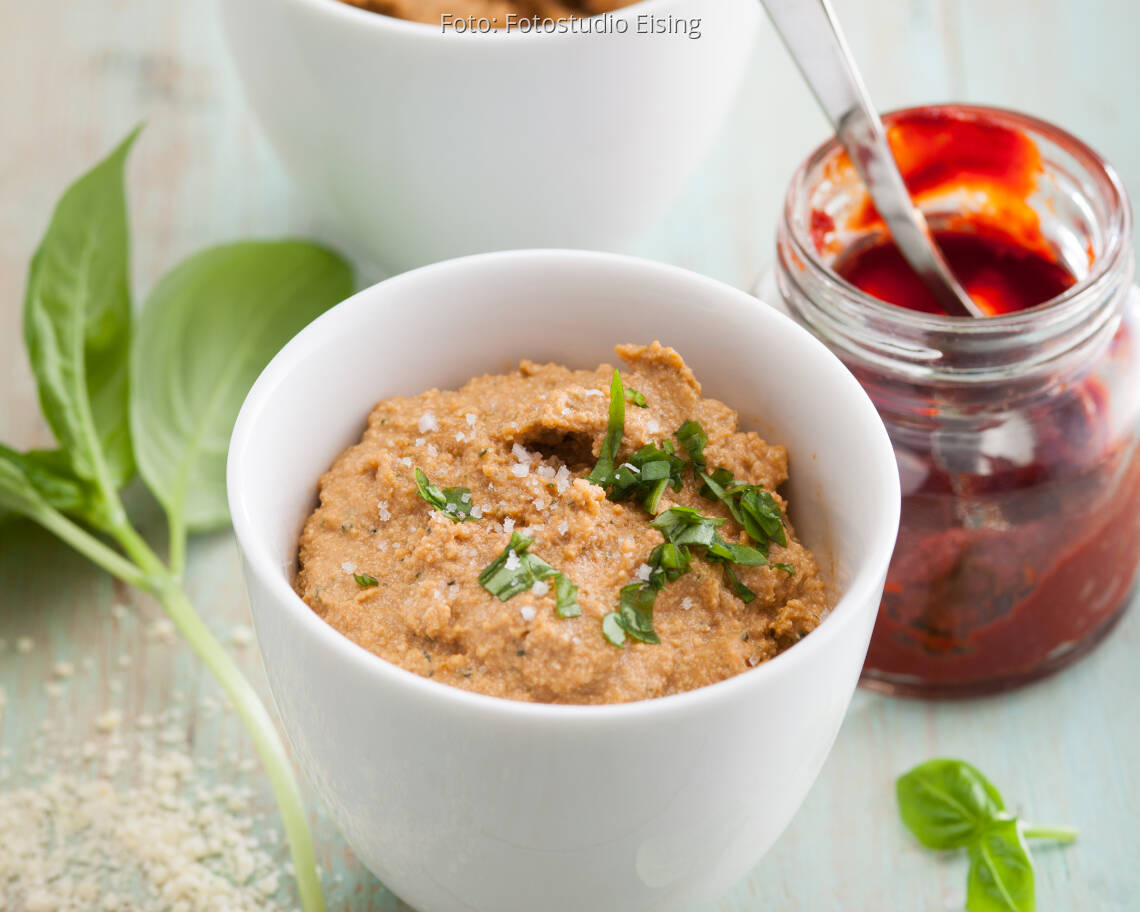 Für einen besonders würzigen Dip geräucherten Tofu verwenden und 1 EL Tomatenmark durch 1 EL rote Thai-Currypaste ersetzen. Das Basilikum dann ganz weglassen.