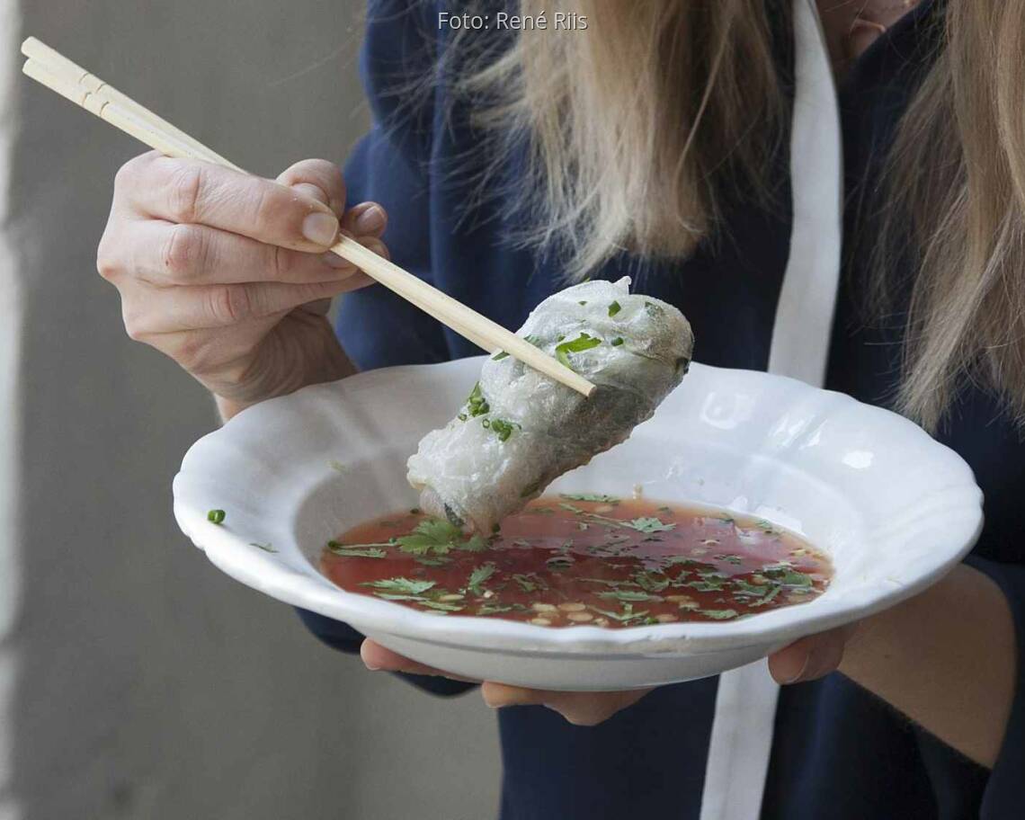 Eine flache Schüssel mit lauwarmem Wasser bereitstellen. Je 1 Reispapierblatt 10–20 Sek. hineinlegen, herausnehmen und auf die Arbeitsfläche legen. Kurz warten, bis das Reispapier flexibel und geschmeidig geworden ist. Dann 1 EL Füllung mittig auf das Blatt legen, den unteren Rand darüber klappen, die Seiten zur Mitte klappen und alles eng nach oben zu einem kleinen Päckchen aufrollen. Auf diese Weise weitere Päckchen herstellen, bis zum Frittieren auf ein Holzbrett legen.