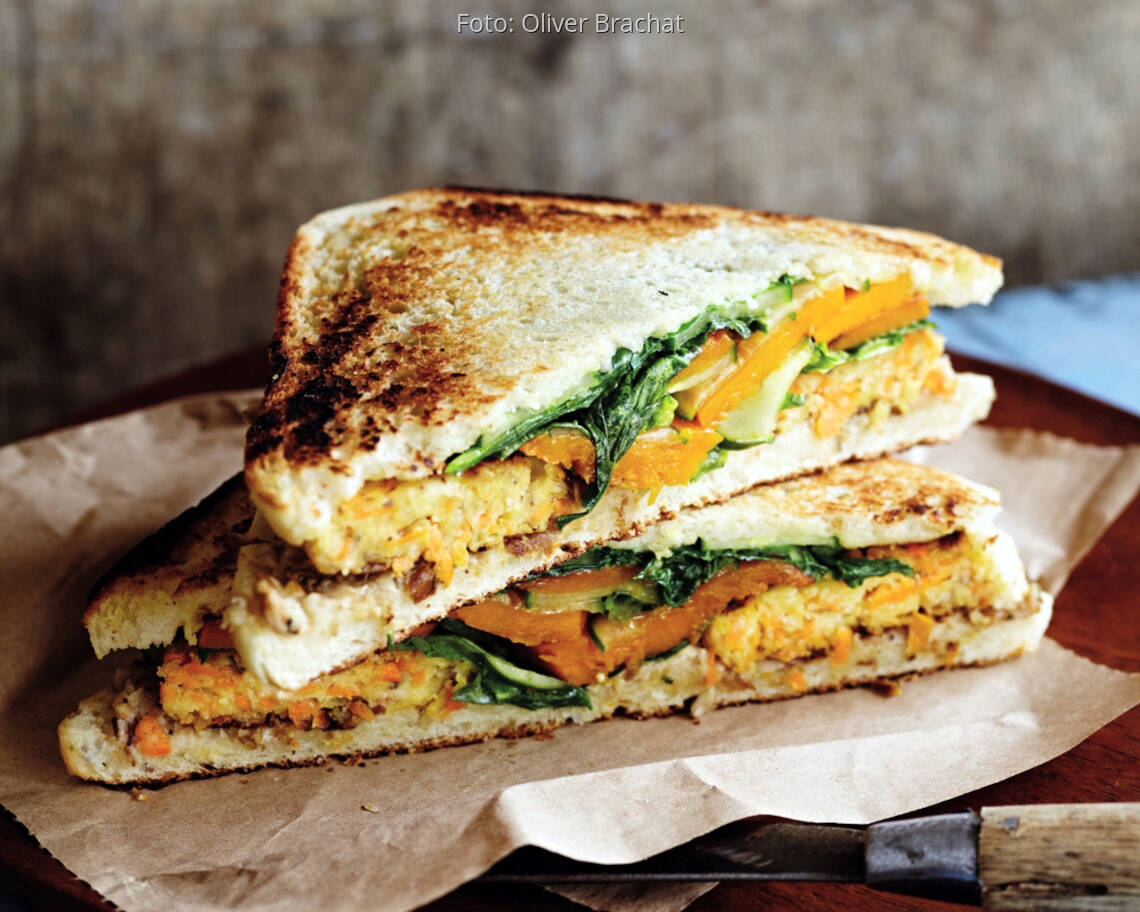 ANRICHTEN Vor dem Servieren das Brot aus der Form lösen und Scheiben (pro Portion 2) abschneiden. Die vorbereiteten Zutaten auf der Hälfte der Scheiben verteilen, mit den restlichen Scheiben bedecken und die Tramezzini in Alufolie einwickeln. In einer Pfanne knusprig ausbraten. Aus der Folie nehmen und diagonal halbieren.