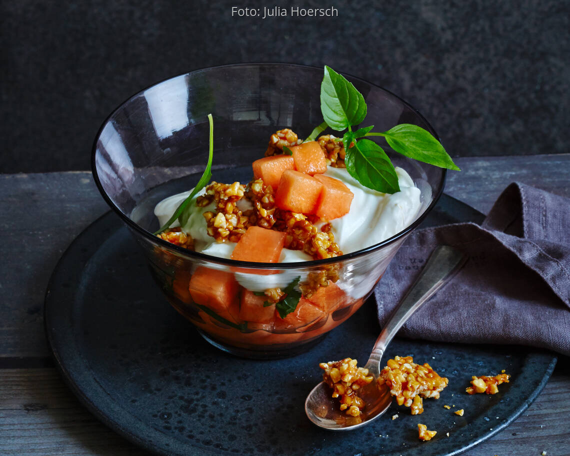 Foto: Julia HoerschTrifle mit Joghurt, Cantaloup-Melone und Mandelkrokant