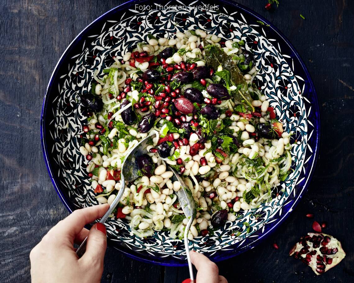 veganes Rezept von Filiz PenzkoferSpieglein, Spieglein an der Wand, welcher Bohnensalat ist der leckerste im ganzen Land? – Weiß die Bohne, schwarz die Olive, rot der Granatapfelkern: Diesen Salat isst jeder gern!