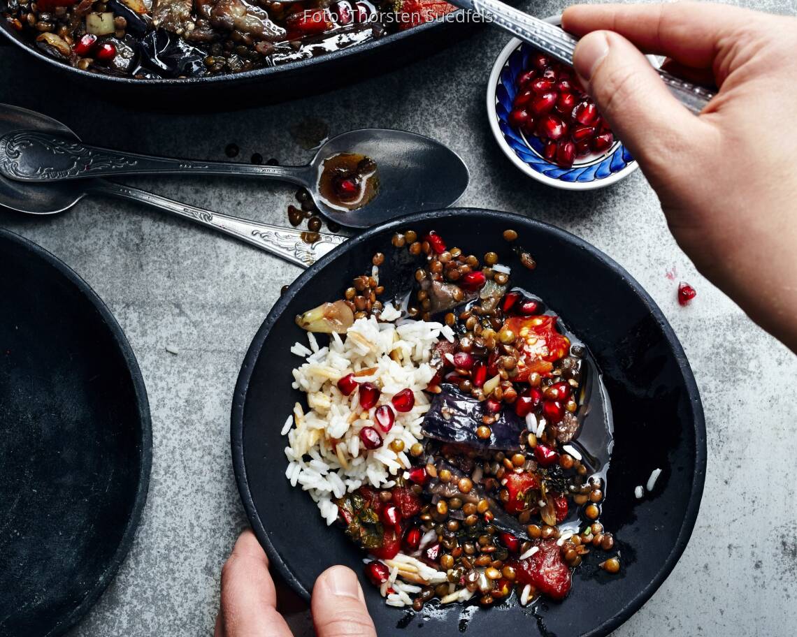 Den Backofen auf 200° (Umluft 180°) vorheizen. Die Auberginenstücke abwaschen und trocken tupfen. Die Auflaufform mit Öl einpinseln. Die Auberginen, die Linsen (mit dem übrigen Kochwasser, falls vorhanden) und das Gemüse hineinschichten und alles mit dem Olivenöl begießen. Den Linseneintopf im heißen Backofen ca. 45 Min. backen, bis die Auberginen weich sind. Die Form herausnehmen, das Linsengemüse mit den Granatapfelkernen garnieren und zu Pilav servieren.