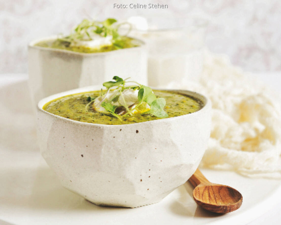 Die grüne Suppe in Servierschalen füllen, einen Tupfer Cashew-Creme daraufsetzen oder Würzhefeflocken darüberstreuen und heiß auf den Tisch bringen.