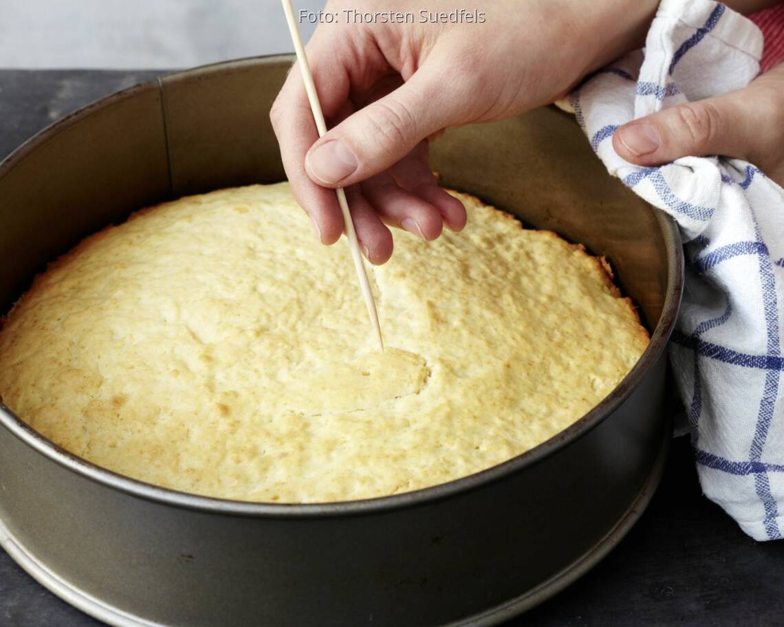 Sobald an einem Holzstäbchen kein Teig mehr klebt, ist der Kuchen fertig. Den Kuchen in der Form abkühlen lassen.