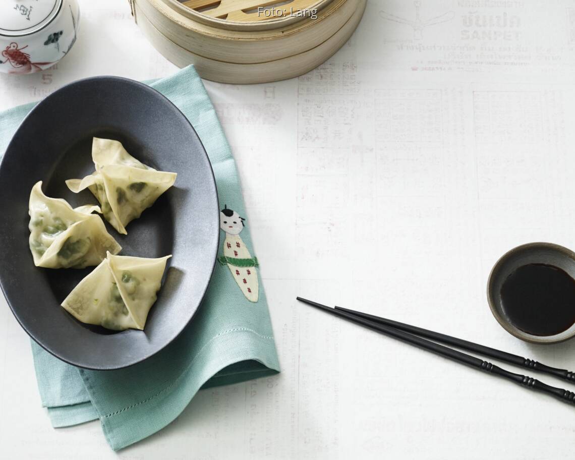 Den Wok säubern, dann zu einem Drittel mit Wasser füllen (ca. 500 ml). Das Wasser bis knapp unter den Siedepunkt erhitzen. Den Boden eines Dämpfkorbes dünn mit übrigem Erdnussöl bestreichen. Wan Tan hineingeben. Den Dämpfkorb verschließen und in den Wok setzen – der Boden darf das Wasser nicht berühren. Die Veggie-Wan-Tan in ca. 10 Min. garen und heiß servieren, z. B. mit einer süß-scharfen Chilisauce.