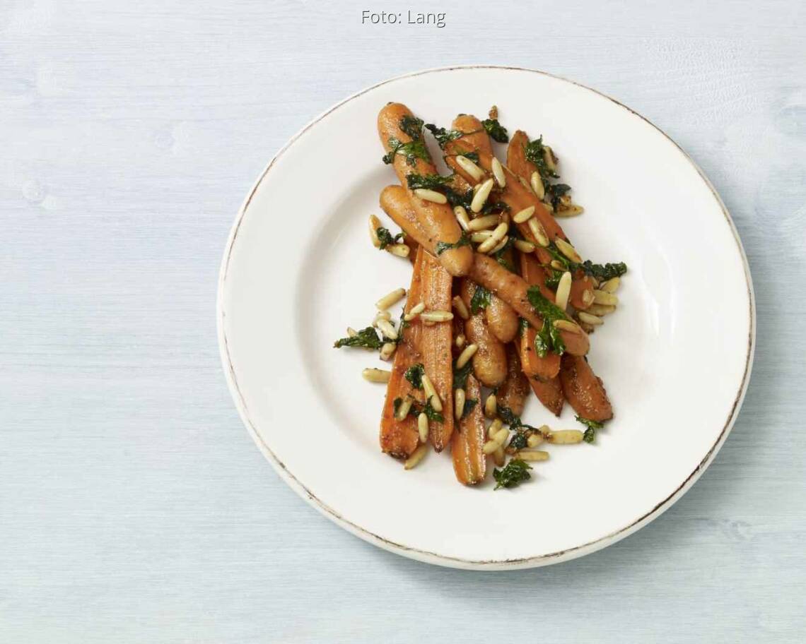 Eine fruchtige Ergänzung passt bestens zu den Möhren. Grob zerbröselte Apfelchips, in Streifen geschnittene getrocknete Aprikosen oder getrocknete Cranberrys mit den Pinienkernen in die Pfanne geben und alles wie beschrieben fertig garen.