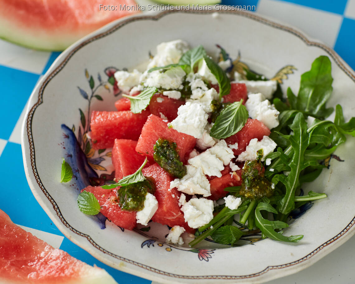 Foto: Monika Schürle und Maria GrossmannWassermelonen-Feta-Salat mit Pistazien-Minz-Pesto