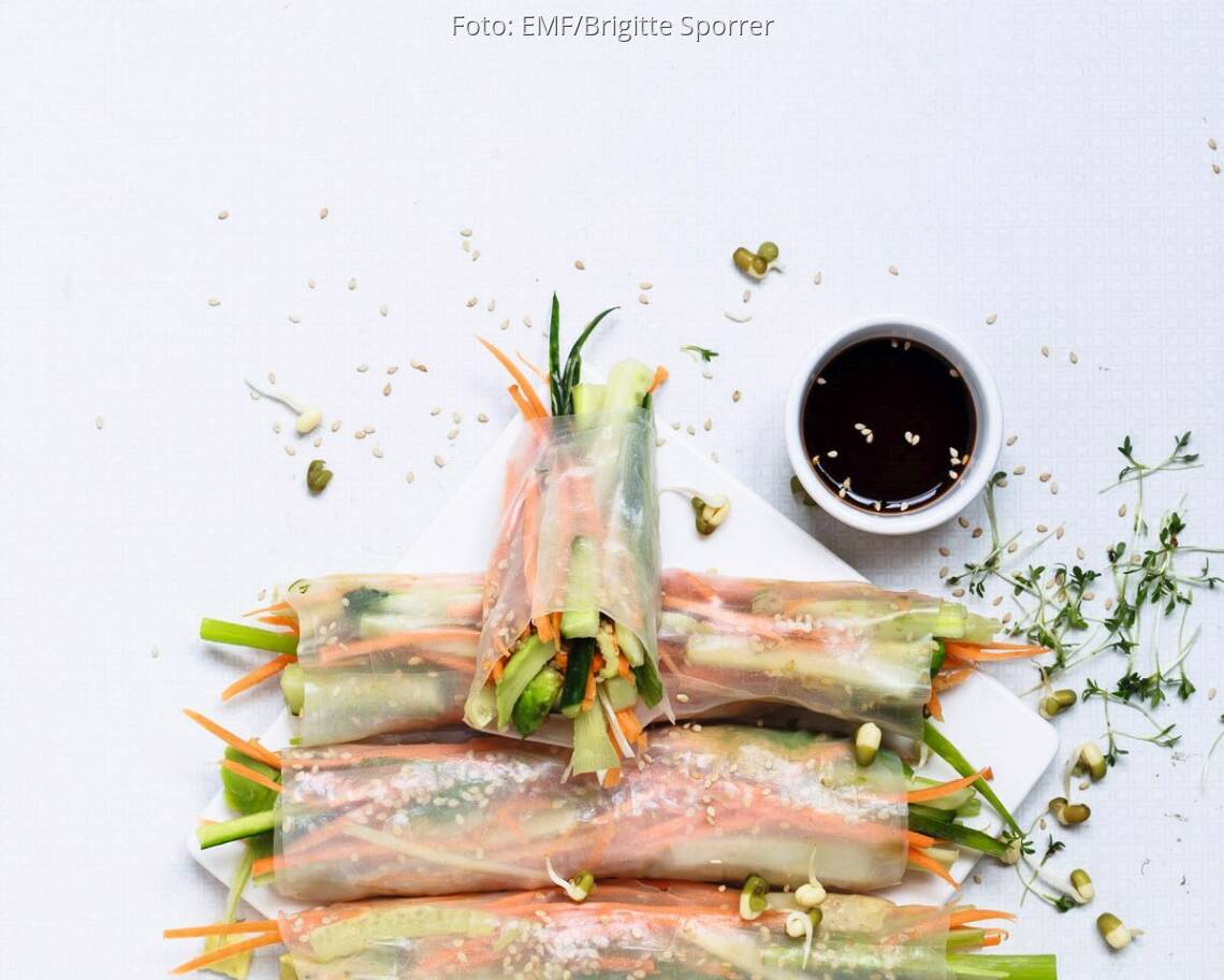 Die Reispapierblätter kurz in eine Wasserschüssel eintauchen, mit Gemüsestreifen, Sauce und Sesamkörnern belegen und einrollen.