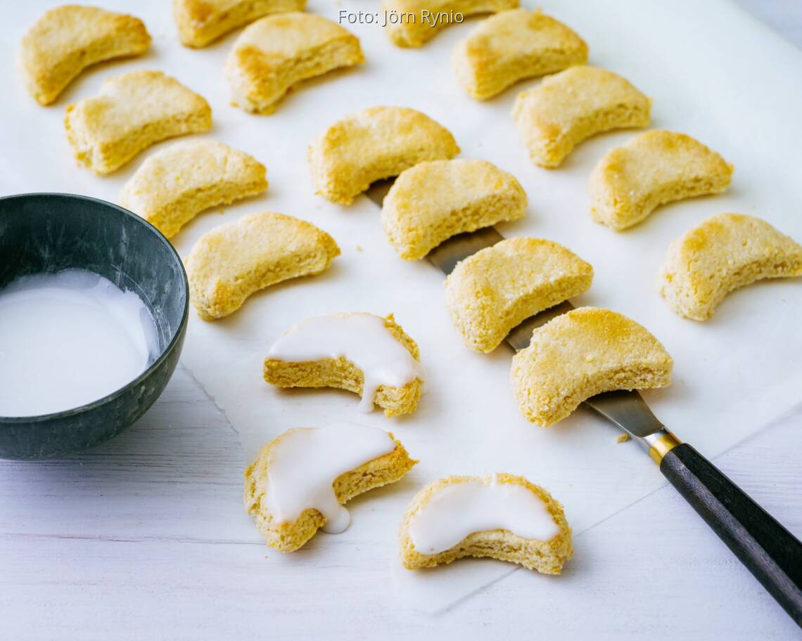 Den Teig auf ein mit Zucker bestreutes Backbrett geben, flach drücken, mit Zucker bestreuen, mit Frischhaltfolie bedecken und zu einer ca. 1 cm dicken Platte ausrollen. Halbmonde ausstechen, auf die Bleche setzen und 2 Std. trocknen lassen.