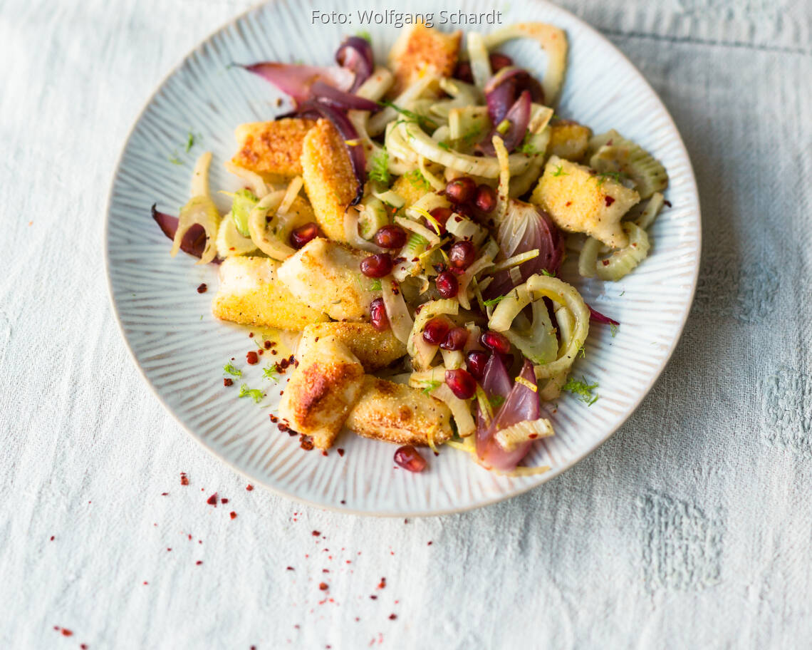 Für das Fenchelgemüse den Fenchel putzen und waschen. Das Fenchelgrün abzupfen und beiseitelegen. Die Fenchelknollen längs halbieren, den Strunk entfernen und den Fenchel quer in feine Scheiben schneiden. Die Zwiebeln schälen und in dünne Spalten schneiden. Die Fenchel- und Kreuzkümmelsamen im Mörser grob zerstoßen. Die Kerne aus dem Granatapfel herauslösen.