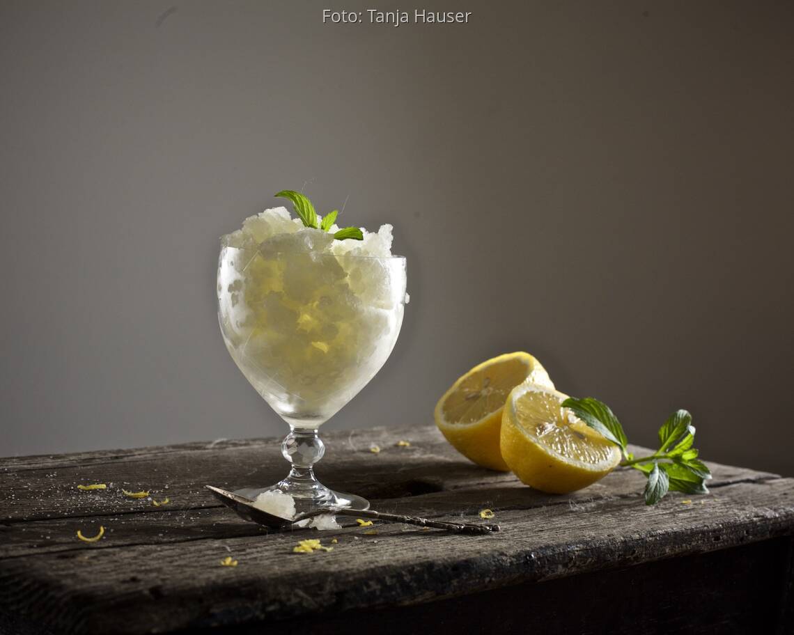 Nun kann der Zitronensaft durch ein Haarsieb zum Sirup gegeben werden. Die Mischung gut verrühren und etwa 45 Minuten durchziehen lassen. Dann in ein flaches Gefäß geben und ins Eisfach stellen. Nach etwa einer Stunde mit einer Gabel umrühren und wieder für eine Stunde ins Eisfach stellen. In den nächsten drei Stunden immer wieder umrühren.