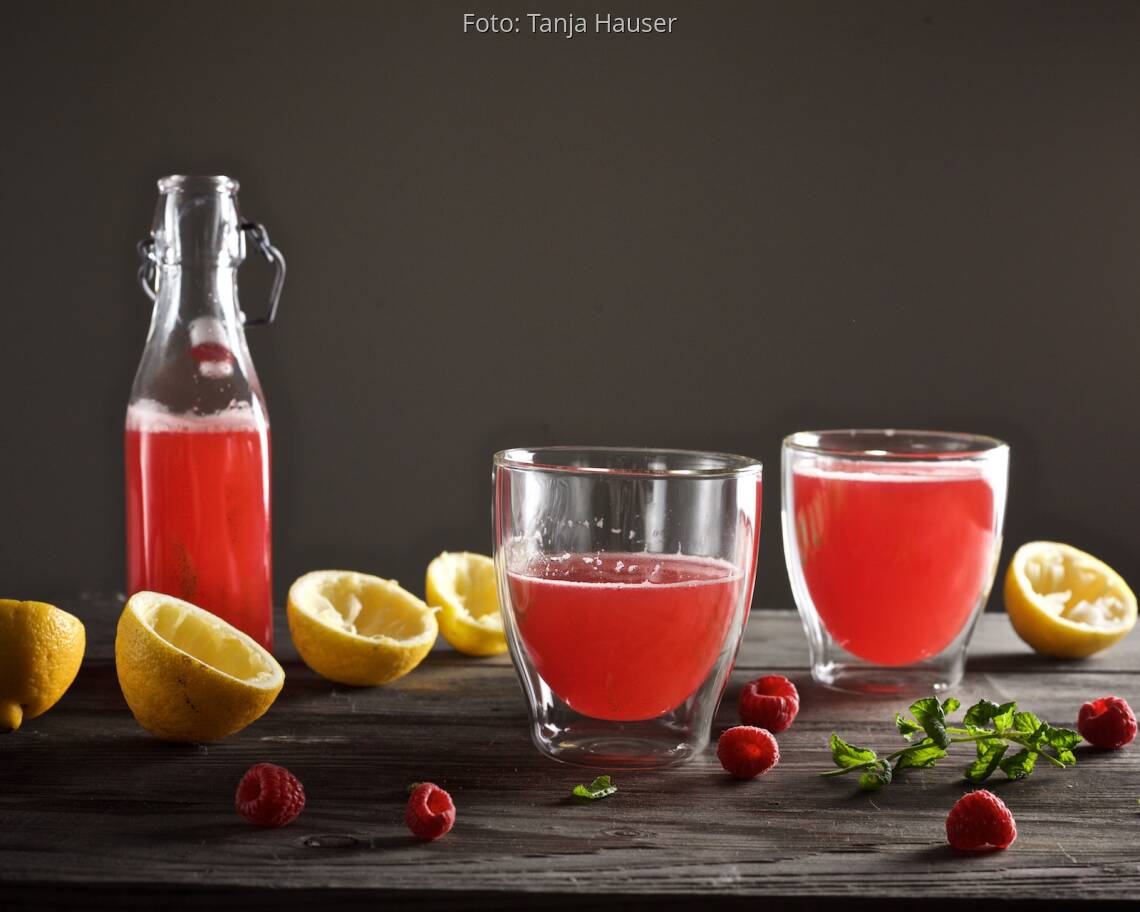 Dann die Himbeeren waschen und in ein hohes Gefäß geben. Nun etwas Wasser einfüllen, bis die Himbeeren fast bedeckt sind.