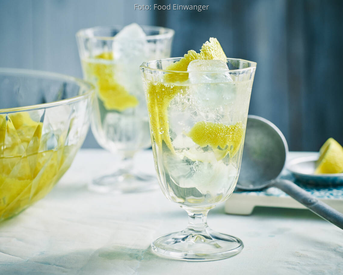 Die Zitronen auspressen und den Saft durch ein feines Sieb zum Zitronenwein gießen. Restlichen Wein und den Prosecco aufgießen, die Eiswürfel dazugeben und die Bowle servieren.