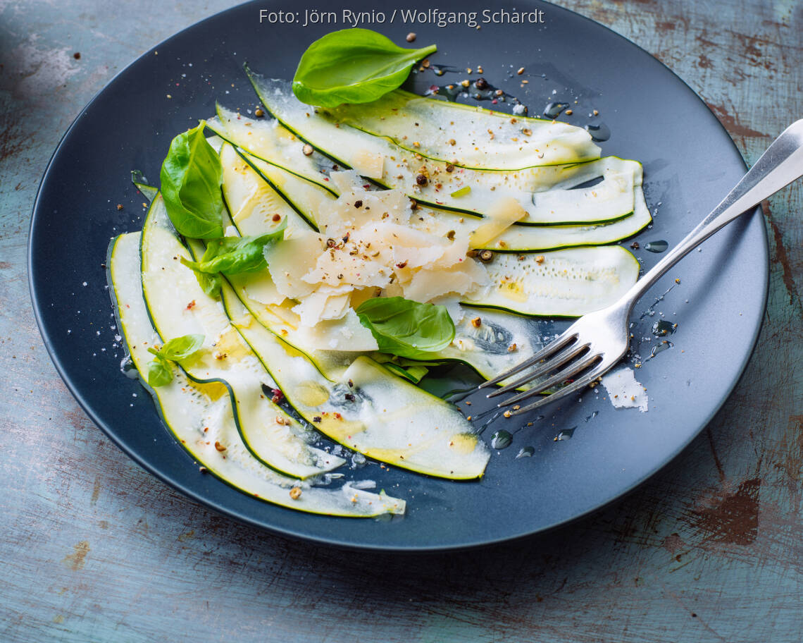 Vor dem Servieren den Parmesan mit dem Sparschäler grob raspeln und zusammen mit Basilikum oder Minze auf die Zucchinischeiben streuen.