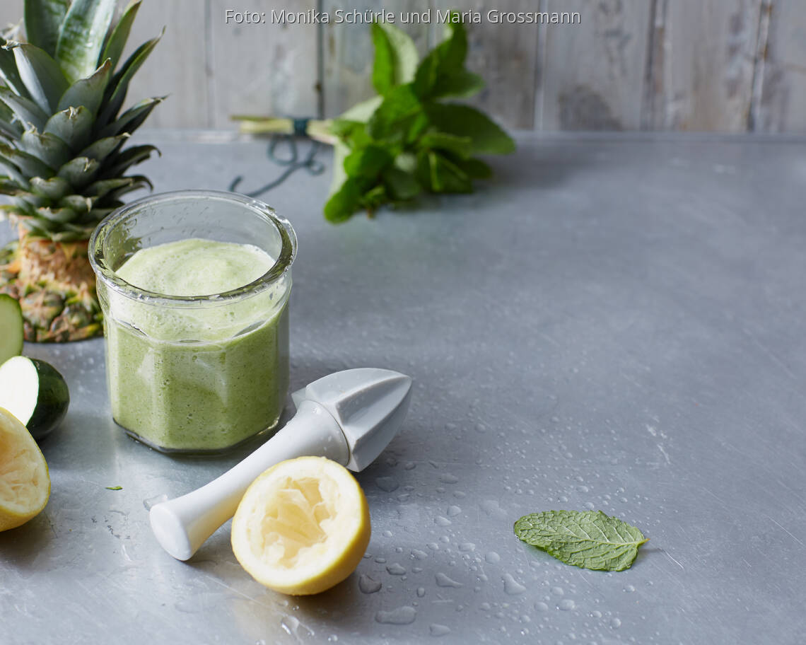 Die Zitrone auspressen und den Saft mit Ananas, Apfel und Minze in den Mixer geben. Wasser hinzufügen und alle Zutaten auf höchster Stufe mixen, bis der Smoothie schön cremig ist.