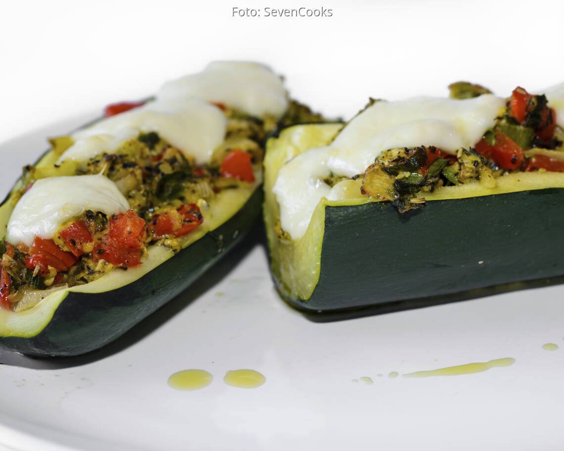 Tomatenwürfel dazugeben und mit Steinsalz und Pfeffer kräftig abschmecken. Das Gemüse in die ausgehöhlten Zucchini geben und mit Mozzarella belegen.