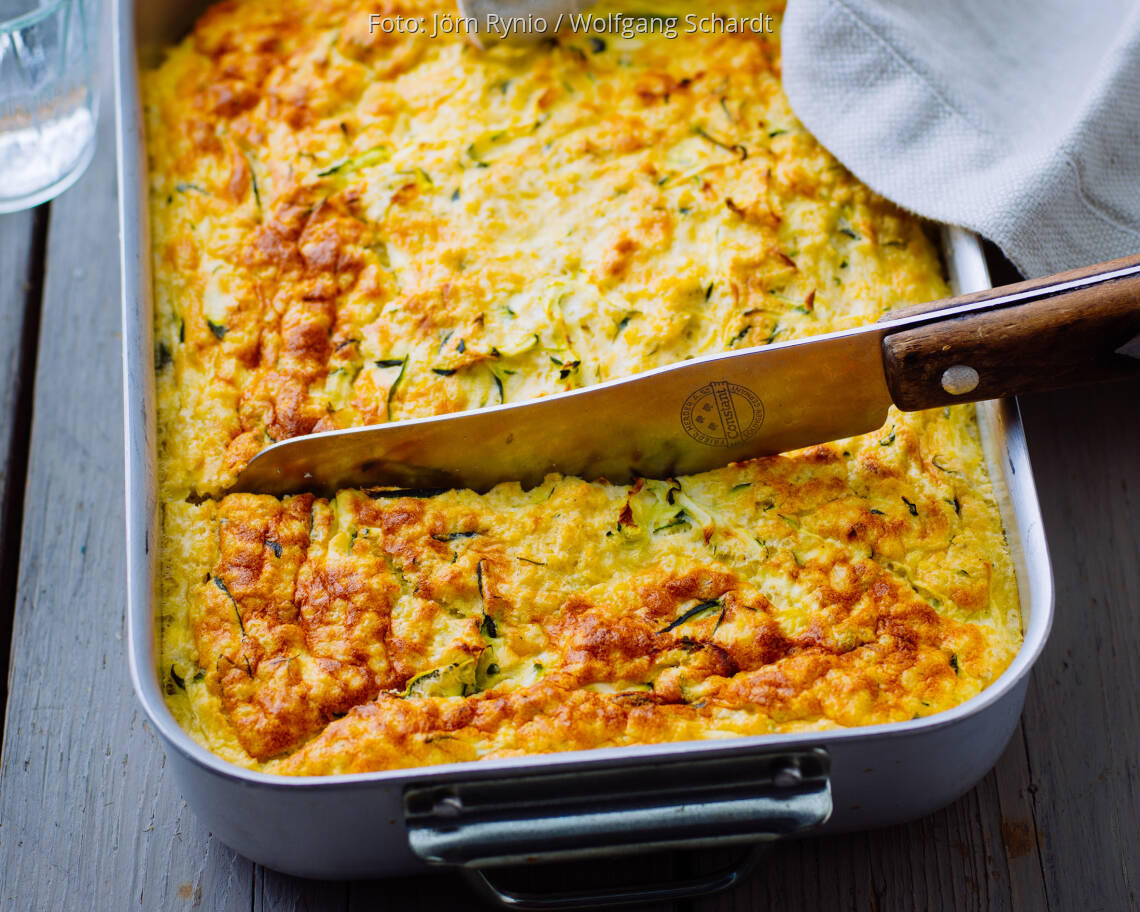 Die Eier trennen und das Eiweiß mit 1 Prise Salz zu steifem Schnee schlagen. Die Eigelbe mit dem Quark verrühren und unter die Hirsemasse ziehen. Dann vorsichtig den Eischnee unterheben und die Masse in die Form füllen. Den Auflauf im Backofen (Mitte) in ca. 40 – 45 Min. goldbraun backen. Aus dem Ofen nehmen und beispielsweise mit Blattsalat und Tomatensauce servieren.