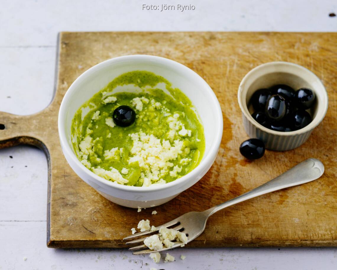 Den Schafskäse mit einer Gabel zerbröckeln und unter die Zucchinicreme rühren. Diese mit schwarzen Oliven garnieren und zu glutenfreiem Brot servieren.