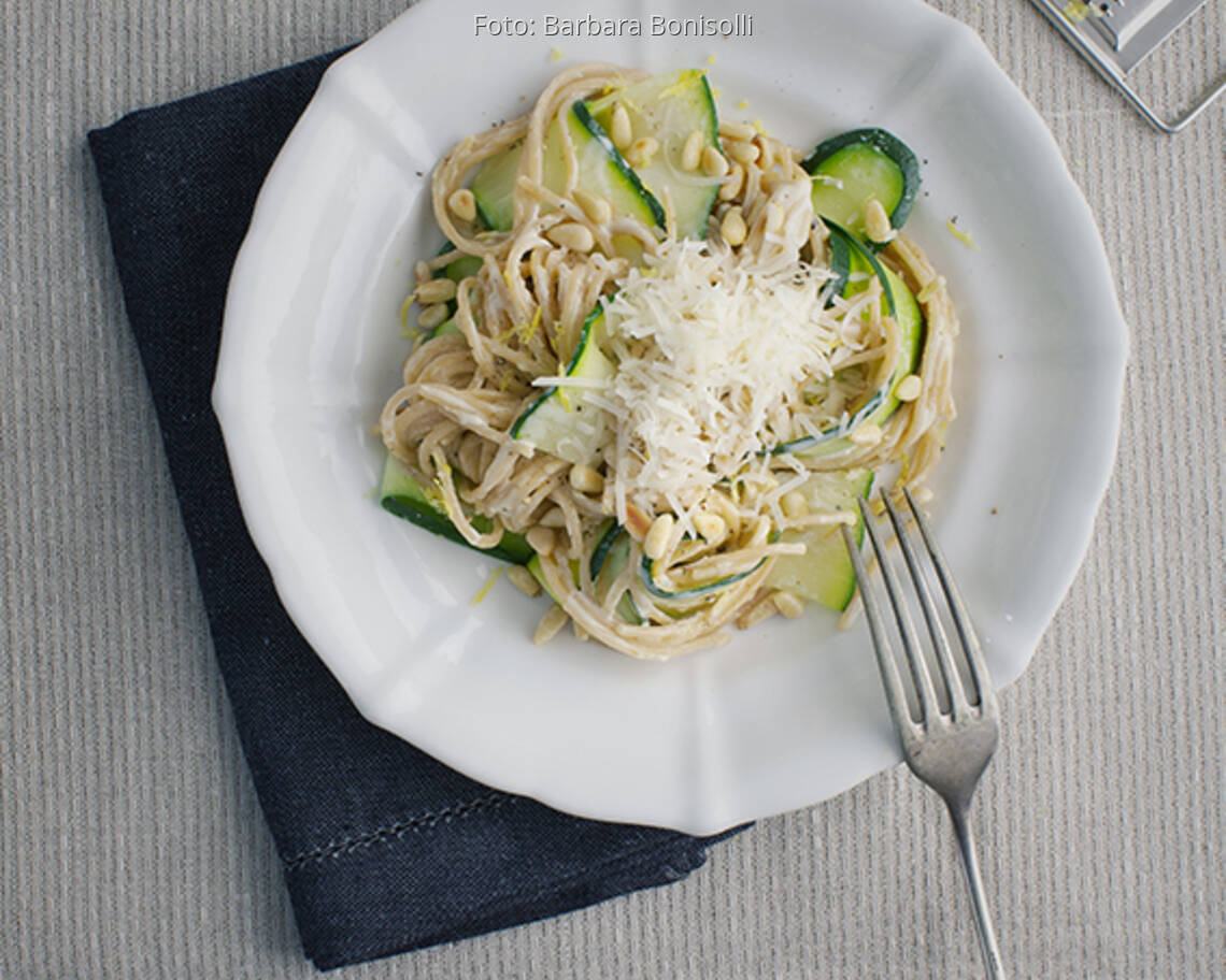 Foto: Barbara BonisolliZucchinispaghetti mit Pinienkernen und Zitronensahne