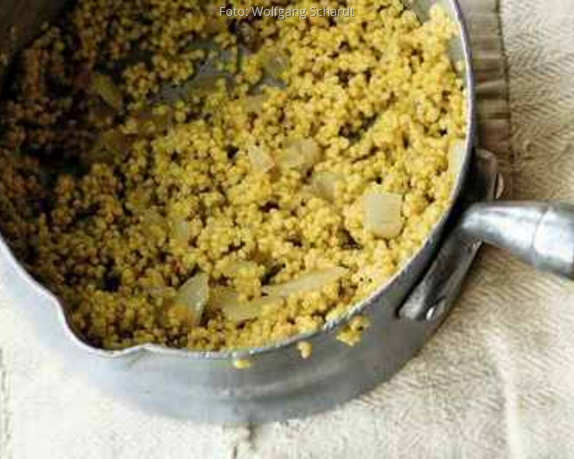 Die Zwiebel-Hirse passt ganz wunderbar zum Apfel-Lauch-Gemüse, eignet sich aber auch als glutenfreie Beilage, z. B. für gebackene Kürbisspalten, und zum Füllen von Tomaten, Zucchini, Paprikaschoten oder Auberginen.