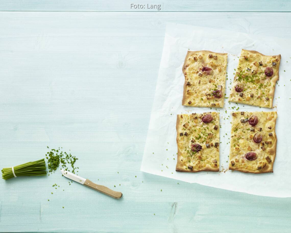 Nach Belieben den Schnittlauch abbrausen, trocken schütteln und in Röllchen schneiden. Fertigen Zwiebelkuchen aus dem Ofen nehmen und vierteln. Auf Teller verteilen, eventuell mit Schnittlauch bestreuen und servieren. Währenddessen den zweiten Zwiebelkuchen backen.