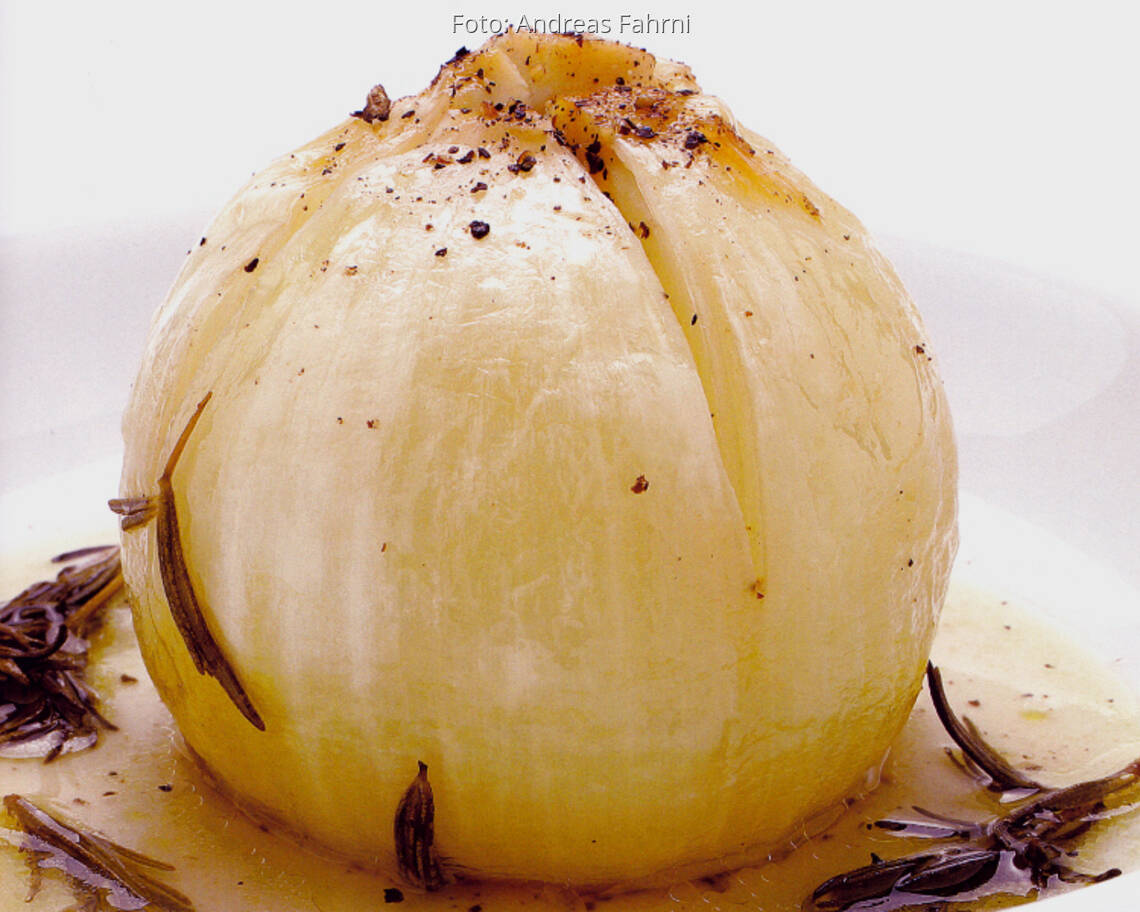 veganes Rezept von Annemarie WildeisenEinfacher und schneller geht es fast nicht mehr: Zwiebeln schälen, mit Rosmarinzweiglein, Salz und Pfeffer in Alufolie wickeln und im Ofen backen. Serviert man sie als vegetarische Mahlzeit, passen Salat und ein Safranrisotto oder Bratkartoffeln dazu.